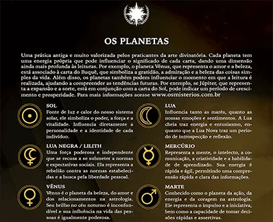 O conhecimento das influências do zodíaco, dos planetas e dos elementos nas cartas ciganas é essencial para ampliar a interpretação do jogo. Cada carta é influenciada por um signo do zodíaco, um planeta e um elemento, que combinados trazem uma mensagem única e poderosa. Não perca a oportunidade de explorar o mundo fascinante dos Mistérios de Lucifer.